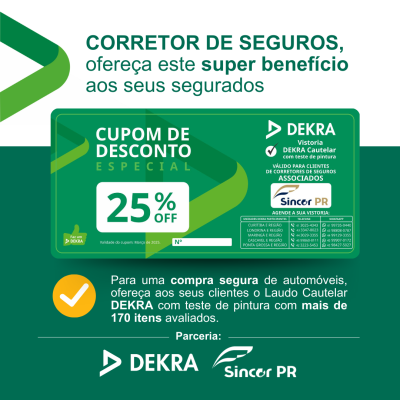Os associados ao Sincor-PR terão direito a cupons com 25% de desconto nos serviços da DEKRA, para serem repassados aos seus segurados.