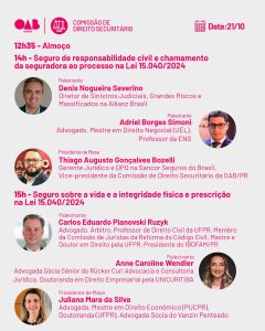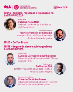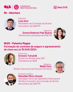 O Sincor-PR estará presente no Simpósio “Nova Realidade do Mercado Segurador: Impactos e Transformações Trazidos pela Lei 15.040/2024 e Lei Complementar 213/2025”, promovido pela Comissão de Direito Securitário da OAB-PR. O evento será realizado no dia 21 deste mês de outubro, das 9h às 18h, na sede da OAB-PR (Rua Coronel Brasilino Moura, 253, Ahú, Sala Democracia, em Curitiba), em formato exclusivamente presencial.